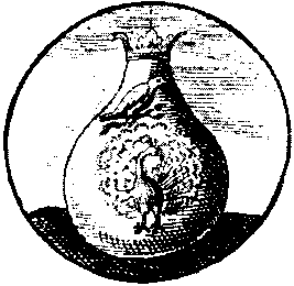 A peacock inside a crowned flask extends its resplendant tail. Above in the neck of the flask, a bird sits on a branch.