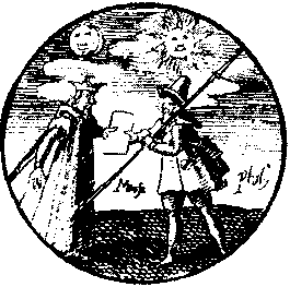 A man on the right with a spear holds a piece of paper and presents it to a king on the left. In the heavens above the King, the Moon shines down, while above the man with the spear, is the Sun.