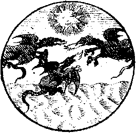 Three fire breathing dragons fight in the skies above an expanse of sea. In the heavens above them a Sun shines.