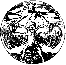 A being half eagle and half man, stands with its wings outstretched. Two bird heads emerge to the left and right, but in the centre is the head of a bearded man in a nimbus of light (Christ figure). Attached to the wings are two human hands held up to show the wounds of the Crucifixion. Behind this image of Christ as eagle, a naked king stands, his arms outstreched as if to help support the Christ-eagle.