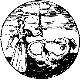 On the right a winged dragon lies on its back and forms an ouroboros. A woman approaches from the left holding up a sword in her left hand.