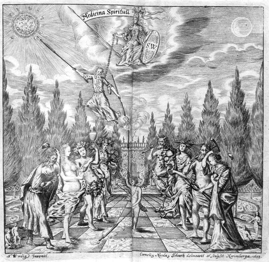 Frontispiece to the first book. 123x126mm. Jove in the clouds, suspends by a chain, an old man, Prometheus, who lights a torch from the Sun and then passes this flame down to a winged cupid with a bow and quiver of arrows. He lights his own torch from that of Prometheus and, in turn, brings it to the earth. This cupid stands between two ranks of gods, who include Aphrodite, Dionysius, a goddess with flowers, Pan, a goddess with cornucopia, Hephaestus-Vulcan. In the foreground, a man and a woman throw rocks over their shoulders, and behind them appear small human men and women. "S. Wirdig. Invenit. Cornelius Nicholas Schurtz delineavit et sculpsit Norimbergae 1673."