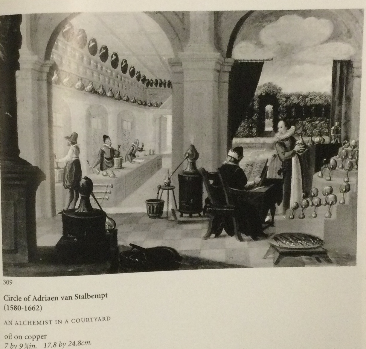From an oldish (1998) Sotheby’s catalogue, this b/w shot of a small painting with the title: "An Alchemist in a Courtyard."
