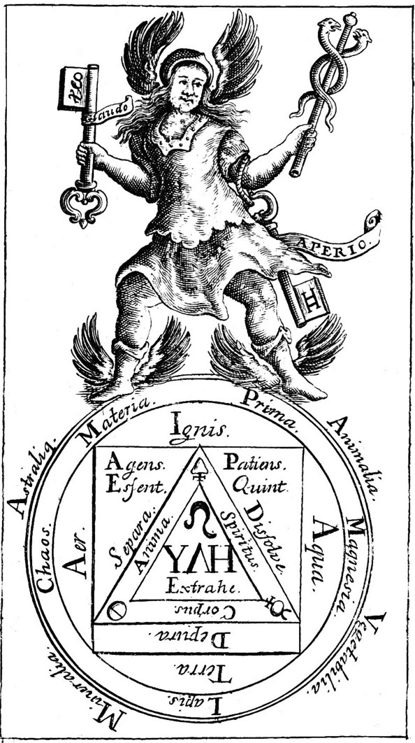 He stands upon a circle, around which is labelled the Animal, Vegetable, Mineral and Starry realms.