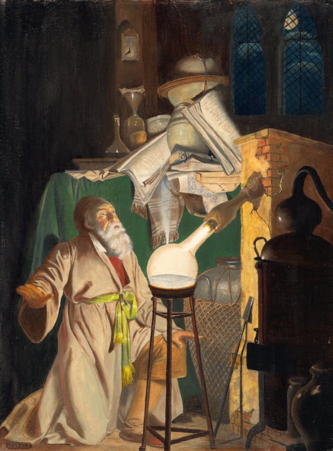This oil painting is McLean's version of a section of Joseph Wright of Derby's famous image of the Alchymist made in the 18th Century.