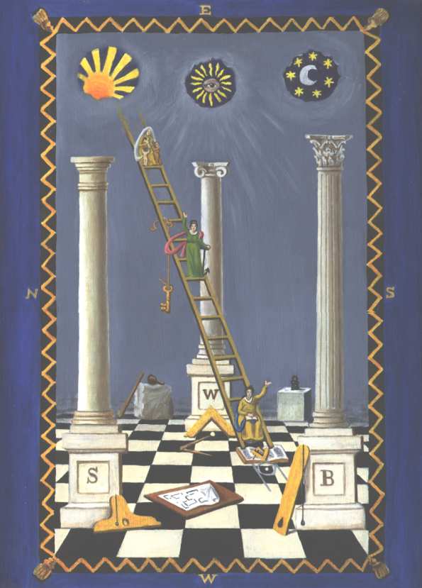 This oil painting is McLean's facsimile copy of a 19th century masonic tracing board.