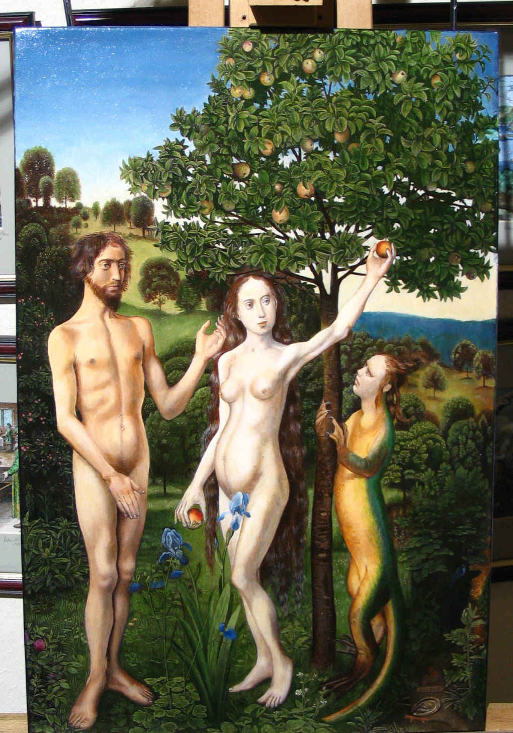 This oil painting is McLean's version of the Temptation by the 15th Century Flemish painter Hugo van de Goes .