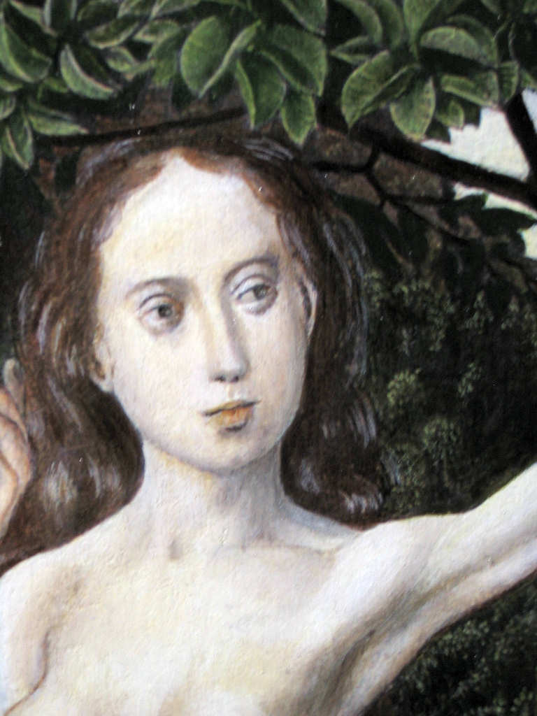 This is a detail of the head of Eve from McLean's version of the Temptation by the 15th Century Flemish painter Hugo van de Goes .