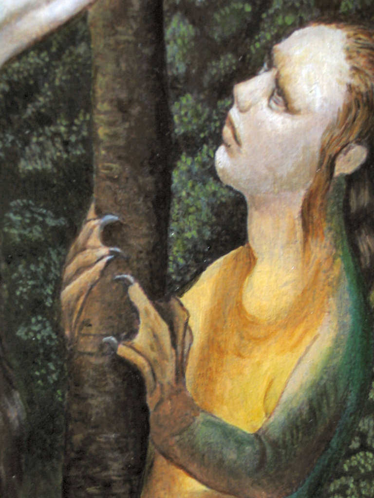 This is a detail of the head of Lilith from McLean's version of the Temptation by the 15th Century Flemish painter Hugo van de Goes .