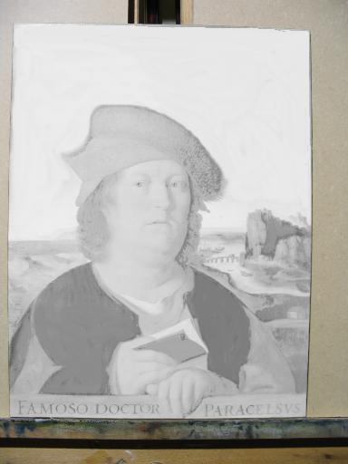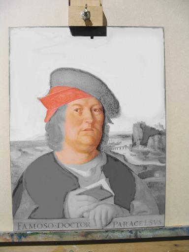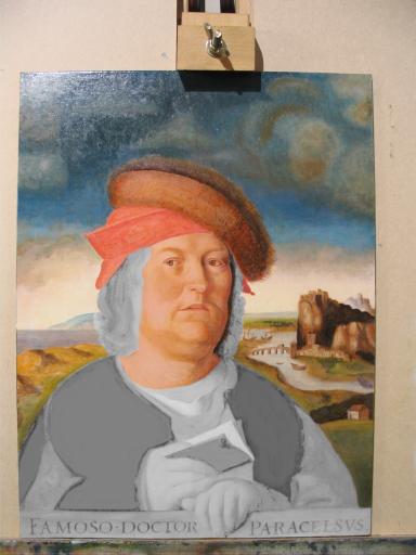 Worked on the hair and his cloak. This ties the whole painting together tonally and allows me to see the areas that require adjusting somewhat in tone. The main forms are now established but this is just the initial layers of paint. Much overpainting will be required to model the forms more exactly. I will have to darken the sky with some overstippled layers and the face itself requires a lot more work. But one can now see the painting emerge.