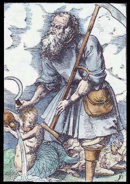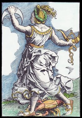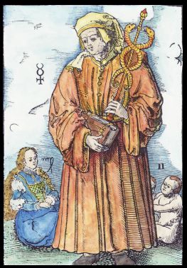 A few years ago I found an interesting illustration in a modern French book on alchemy. This engraving clearly showed a figure carrying a shield with sun, moon stars and winged heart and I put it down as an alchemical emblem. This modern French book did not identify the book from which it was taken, except to say it was an illustration in a work of Louis Cadet de Gassicourt (a late 18th and early 19th century writer). I asked some colleagues what it could be and one suggested that it was most likely an emblem of St Jerome with no alchemical significance. I put it in my pile of images to colour and eventually forgot about it. A week or so ago it surfaced from a pile of images and I decided to hand colour it. A few days later I was in the University library looking at some art books, when suddenly I spotted a woodcut by Durer that was of the same image, the only difference being, that the engraving was a mirror image of the Durer. I realised how stupid I had been. The figure in the Durer woodcut is holding his staff in his right hand, while in the engraved version it was in his left. The engraving had obviously been copied from the Durer, as this printing process reverses the left and right sides of an image. I should have noticed that earlier. The Durer woodcut is quite delightful and I immediately began making a coloured version of this image also. The Durer woodcut was made in 1494 and was included in an Italian book Gerson nei panni del pellegrino ("Gerson in the clothes of a pilgrim"). Jean Gerson (1363- 1429) was French scholar, educator, reformer, theologian and poet. So this image is not alchemical but certainly allegorical and emblematic. I show the two images side by side (the Durer on the left and the later engraving on the right.