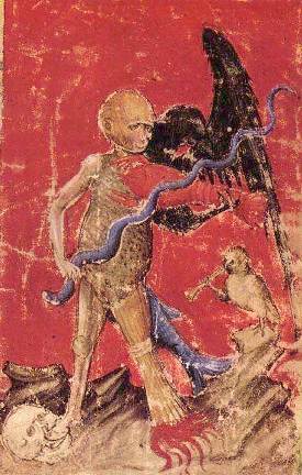 Many illuminated manuscripts are religious in nature, being Books of Hours or other devotional tracts. There must be tens of thousands of Books of Hours preserved in libraries and private collections, and they regularly appear in fine art auctions. During the 14th and 15th centuries there arose a class of people who became relatively wealthy, and one way they could display their status and wealth was to have scribes and illuminators prepare a lavish personal book of devotion. Apart from a few notable examples, I find the content of most of these, though often having amazingly beautiful paintings within them, does not truly engage me. However, there was arising in that time other more secular works, which often allowed the artist a freer expression outside the straightjacket of the formulaic Book of Hours. Thus we find a number of manuscripts with illuminations of Dante, Boccaccio, and even stories such as the Roman de la Rose, Tristan and Isolde. Ovid's Metamorphoses provided a opportunities for the artist/illuminators to explore emblematic material. Here is a beautiful example of Hermaphoditus and the nymph Salmacis from a manuscript of the Metamorphoses in the Bibliotheque Nationale. Astronomical/astrological works began to appear with many wonderful illustrations, even a particular format depicting the Children of the Planets. The Apocalyse provided a source of powerful emblematic imagery and many manuscripts appeared exploring this theme. We also find manuscripts depicting the Triumphs of Petrarch, processions in which a triumphal chariot is being pulled by various people or animals, and this was so popular a format that the imagery was extended beyond that expressed in Petrarch's poems. Indeed, by the 15th century, manuscript illumination had expanded far outside the formula of religious devotional works. This is what makes the artwork of this period so exciting. There is so much to uncover and explore here.