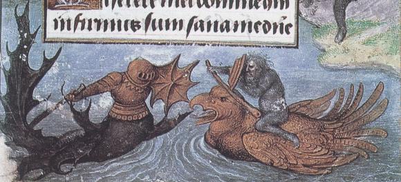 Following up on the zitirons (also known as Zeeridders) a correspondent pointed out to me another example in a manuscript in the Koninklijke Bibliotheek in the Hague of Jacob van Maerlant's poem Der Naturen Bloeme. Jacob van Maerlant lived in the 13th century but this particular Flemish manuscript with many illuminations was made around 1350.