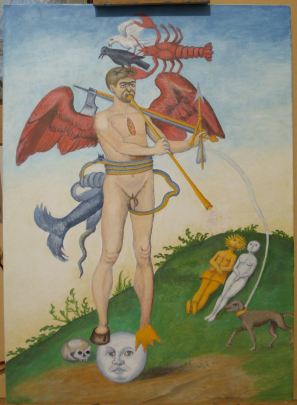 This is a copy of an illustration of the well known crucified snake from a 18th century manuscript of the Flamel hieroglyphics - the Molinier manuscript in the Bibliotheque Nationale. I am planning to create copies of all the images from this manuscript.