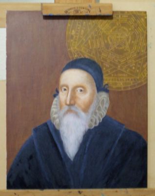 A few years ago I made a portait of John Dee copying the image from the painting in the Ashmolean in Oxford. I managed to sell this, and a few months ago another person asked me to make a similar portrait. Rather than a straight portrait, I decided to put the Aemeth diagram in the background behind Dee. This person agreed to commission me to do this. I have now made some progress and this is how the piece stands at present. I may put another glaze over the background to make it less prominant. Hopefully it should only take another ten hours to complete.