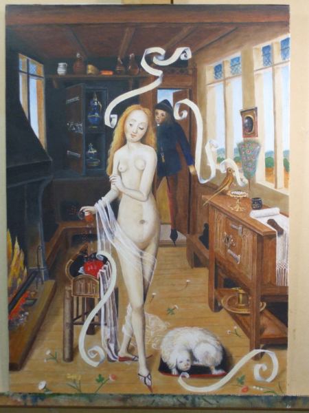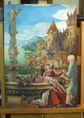 on this a few years ago but I grew unhappy with my work then and abandoned it unfinished. I recently decided to attempt it again, this time at a slightly larger scale. The elongated proportions of the female figure may seem unnatural, but these were part of the pictorial style of that period, as we see in the nude figures of Lucas Cranach the Elder, made some time after this painting.