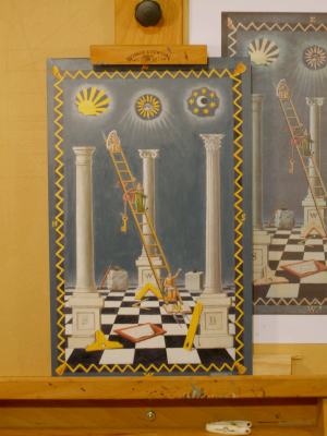 This early 19th century painting of a masonic tracing board by Josiah Bowring is quite well known. I have been comissioned to make a copy of this. Although the painting looks finished in this photograph, it actually needs a lot more work on the details.