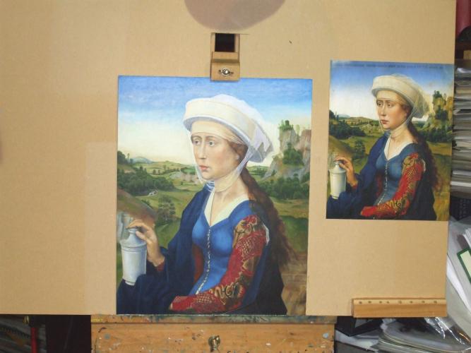 This is a wonderful 16th century Flemish painting by Rogier van der Weyden. It is one component of a triptych made for a wealthy merchant. I really love the way Rogier has placed this figure in a stylised Northern European landscape. This stylised landscape seen in 16th century Flemish paintings totally engages me. I am painting at about the actual size of the original. It should be finished in April or May. The painting of this period is characterised by the artists pushing towards the limits of technique. There is absolutely no reason for Rogier to have created such a complex sleeve on Mary's costume, with all its textures and detail, but he took virtuosic joy in challenging himself to achieve the effect. It is a totally different picture to paint from the Mona Lisa. With the van der Weyden I rarely used anything larger than a 00 or 0 brush, while the Mona Lisa required somewhat larger brushes, 1 and 2's, and even some flats in places. I think I prefer working with the more detailed brushes, though it does burn up the hours.