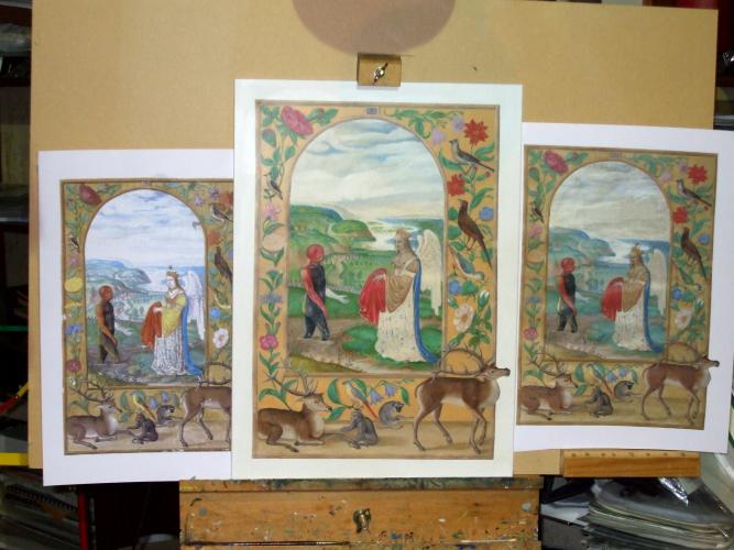 Nürnberg on the right. Because this was an detailed illumination on vellum it would not be possible to paint this in oils at the same size, so I have enlarged it to about twice the original size. Even on this larger scale reproducing the details is proving rather exacting.