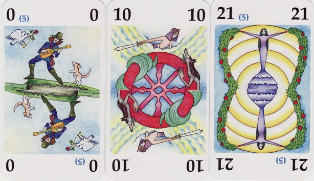 18th Oct 2007 I don't usually collect Jeu de Tarot, those French decks used to play the card game, but every now and again a deck in this style appears which has its twently two trumps reflect the tarot imagery. A deck has recently appeared for the game of Troccas which is apparently still popular in some parts of Switzerland. This game seems to be known in Japan as this deck the Nakayoshi-Mura Tarot is a souvenir of the 1000th meeting in 2006 of the Nakayoshi-Mura Club (in English, "Friendly-Village"), a game-club specializing in traditional games, Tarock, Uno, Chess. etc. I obtained this deck through the good offices of a fellow collector in Japan. The pips and court cards are conventional, but the majors are rather fine. As with all the game decks, the majors or, rather, trumps, are printed with a mirrored image, so that players do not give away to their opponents the fact that they have a trump if they turn it upright.