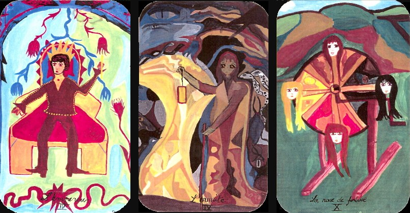7 Apr 2008 This morning the postman woke me up with a package from Amazon France. This contained some books I had ordered and a new tarot Tarot sanctum : le grimoire des initiés by Marie-Renée Patry, which comes in a large solid box, which includes a book. The 22 card deck was created by Pierre Foisy. The cards are large and printed without borders. They are presenting tarot as a magical system rather than a divinatory one, so the book deals with all sorts of ways of incorporating tarot imagery into magical ritual. The card designs are for the most part entirely conventional though beautifully worked in a coherent artistic style. Each image (apart from the Wheel and the World) have a textured background on which a circular form is set within the top half of the card space. This bears the card number and its astrological glyph and associated magical symbol. The tarot arcana are then set as the foreground image. The artwork are painted in richly saturated colours, probably in acrylics, with rather good modelling giving a deep three dimensionality. The figures stand out well from the backgrounds and are painted in considerable detail.