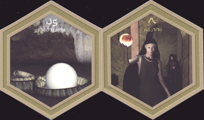 16 Nov 2007 Yesterday I discovered the immanent release of a hexagonal deck of cards based on the chemical elements and incorporating the 22 Tarot Majors. Being interested in chemistry, alchemy and tarot this seemed a must-have deck for me, and I wrote to the artist. In my email I mentioned that I had just a few days ago obtained another hexagonal tarot and he was immediately interested, so I will put up a few details and images here. This is the Tarot of the Golden Desert and it comes in a stained hexagonal cedarwood box, which smells wonderfully of pencil shavings. The deck is designed by Lady Draagonstorm and realised using computer graphics with beautifully rendered surfaces. The artwork presents a science fiction landscape of the 'Golden Desert' in which we see various tableau related to the tarot imagery, which is explained in the accompanying booklet (hexagonal of course!). It is an edition of only 50 copies so will probably sell out relatively quickly.