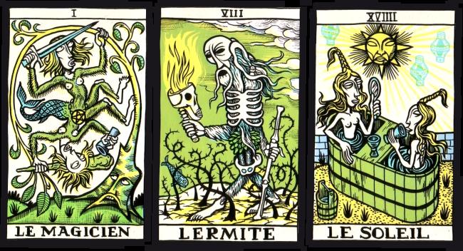 12 Mar 2008 The Museo dei Tarocchi in Italy has just issued I Tarocchi dell'iride (the tarot of the rainbow) by Claudio Parentela, an illustrator, painter, photographer, cartoonist, collagist, and prolific freelance journalist in the international underground scene, having produced many illustrations for magazines and books worldwide. His tarot deck is in a signed and numbered edition of 100 copies. The images are very busy, and brightly coloured, using for the most part unmixed colour (perhaps the idea of using a rainbow palette of colours). They are made to look like silk-screened art. The style, to me, is reminiscent of 1960's underground comic art, such as seen in Oz magazine. The images are quite conventional, though translated into and filtered through Claudio Parentela's style and method of working. You can see some of his other work, including the black and white pen drawings made for this tarot and others, on his website