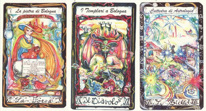27 December 2009 Last week I received one of the latest batch of tarots from the Museo dei Tarocchi in Italy. This is the Bologna Magica... Al Top by Mariarita Frazzoni, in a limited edition of 300 copies. There are a number of tarots issued in Bologna in the late 18th and 19th centuries, and a modern one of Luigi Mattei (1982). This new one from the Museo dei Tarocchi refers to architecture features of the ancient city, but with the artwork in a modern cartoon style, brightly coloured and highly detailed, each card having a different decorative border. Il Mago refers to the Piazza Maggiore, La Morte to the Church of San Procolo, La Temperanza to the Old Jewish Quarter and so on. I was particularly engaged by La Forza which refers to the Bologna Stone and the mysterious riddle of the little verse on Aelia Laelia Crispis. The artwork here is somewhat reminiscent of some of the designs by Amerigo Folchi.