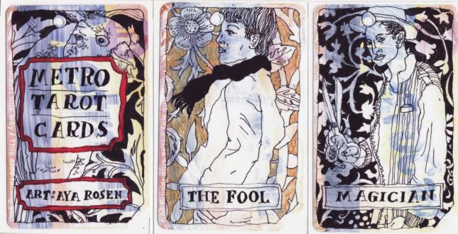 3 June 2010 A week or so ago I received a new tarot by Aya Rosen. Aya is well known for her Black Lily Tarot which she self-published and sold on etsy.com where you can find this and her other artwork on the page louchelab.etsy.com. Aya's work is immediately recognisable by her distinctive drawing style. Her new tarot is the Metro Tarot. It is a set of smallish cards and comes in a soft leather sleeve.