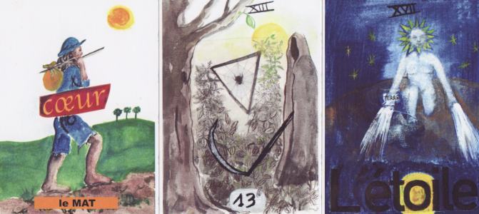 17 March 2009 The rather attractive Tarot de Tours, by the French painter and sculptor, Sylvian Badina, arrived today. It is rather minimalist, reducing the figures to simple forms, while also using a restricted muted palette of greens and browns. The cards are, for the most part, renamed, but the imagery is classic tarot. Needless to say, the artist lives in Tours.