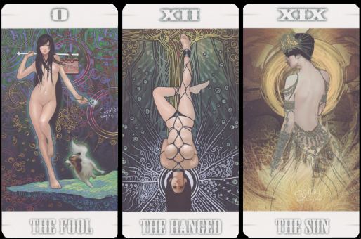 14 July 2009 A month or so ago I received a copy of a tarot from China with rather creative artwork. This has been self published by Tran Kwang Inn. The imagery is transexual in beautifully coloured strong line drawings. This is a very fine production and will be well sought after in years to come.