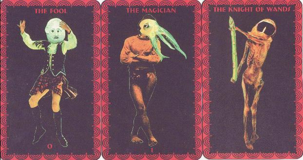 28 September 2009 In 2004 the Book of Kaos Tarot was published in Australia. This has a strong foundation in 'magickal' (Crowley-Thelemite-Austin Spare) imagery and uses the powerful pen drawings of the deliciously named Orryelle Defenestrate-Bascule. This was based on the earlier Bohemian Tarot from 1990 when Orryelle was the more prosaically named Geoff Day, though going by the name of Baron Vermin. I have now been able to obtain a copy of the Bohemian Tarot majors which was issued as a signed and numbered edition of 100 copies. It was published in a folder and has a descriptive booklet originally hand-written rather than typeset. The form of publication reminded me of the earlier Thelemic Tarot of Augustus Donelly from 1977. The Bohemian Tarot cards are rather large 8 by 5.5 inches (202 by 140mm) and Day indicates that it is presented as an art piece serving as an exposition of his philosophy. Many of the card images were reused some 14 years later in the Book of Kaos Tarot, but others were changed to reflect the development of Orryelle's ideas and drawing style. He includes an extra five cards. One is called Blood and thus links to the life force and vampirism. Another is The Grove, while there are three cards forming another suit, the Drug Suit, one being named Drunk, a second being Stoned and the third the Trip. The majors are not titled or numbered but here are the Hierophant, Justice and the Hanged Man, each very different from the images used in the Book of Kaos Tarot. ![]() 27 September 2009 A major exhibition of art by women surrealist artists has just opened at Manchester City Art Gallery here in the UK, entitled Angels of Anarchy. Richard Shillitoe who was the major force behind my publishing the Taro by Ithel Colquhoun a few months ago, has loaned one of the packs of the Taro as an exhibit. He tells me it looks most impressive laid out in a display case. 25 September 2009 I have obtained a rather beautiful tarot from Argentina. This is the Tarot Infinito and was issued (possibly as a promotional item) by Canal Infinito, which was a cable television channel in Buenos Aires mostly providing documentaries on subjects of mystery, occultism and on various pseudoscience and mystical subjects. I am not sure if it is still operating. However, they have created a wonderful tarot, printed on large cards in subtle matte tones, overprinted in some small areas with a glossy varnish, which produces a rather fine effect. The artwork is inventive and engaging.
