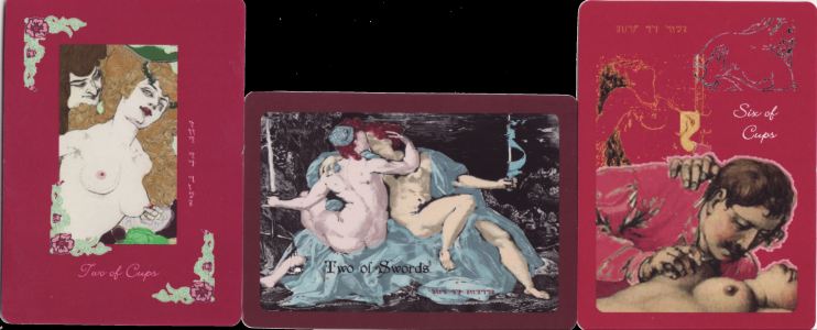 11 June 2010 The Tarot of the Divine Union just arrived. From the title we might be expecting angels, spheres of light, Meister Eckhardt, Jan van Ruysbroeck and St John of the Cross, but when we read the subtitle "Artwork based on masterpieces of explicitly erotic art" and the title of the little white book "The Tarot and the Mysteries of Love and Sex" then we know we are in a rather different realm. Here Cynthia Joyce Clay has taken some of the explicit erotic art, such material as used to be locked away in the "Secretum" Cupboard 55 of the Department of Medieval and Late Antiquities in the British Museum or the "Enfer" in the Bibliotèque Nationale and constructed a tarot deck from these images. Here we find items from Rowlandson, Aubrey Beardsley, Felicien Rops, Kama Sutra manuscripts, Mihaly Zichy, and many 19th coloured engravings from Italy and France. I think these images could be better described as pornographic rather than merely erotic. Anyway the "Divine Union" seems to be all about erect penises and penetration, with a little bit of sado-masochism. I have chosen some of the very few less explicit images in the deck to show here. Strangely the Moon and Death are interchanged, with the Moon as card 13 and Death as 18 - whether in error or deliberate I cannot say. Due to the different formats of artwork, some of the images are in landscape and some in portrait.