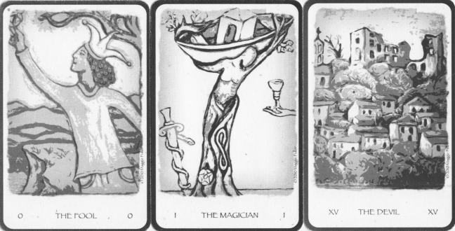 7 April 2010 The Fuller Tarot created by Maggie Fuller arrived a few days ago with a large heavy workbook. The 22 card deck is in black, grey and white. I am a bit perplexed with her choice of imagery for the Devil card, which seems merely to show a village of houses on the side of a hill. The Magician also puzzles me, with the tree-like figure holding a boat above its head, though here we have some of the familiar symbols of the tarot Magician, pentacle, sword, infinity symbol, chalice, etc.