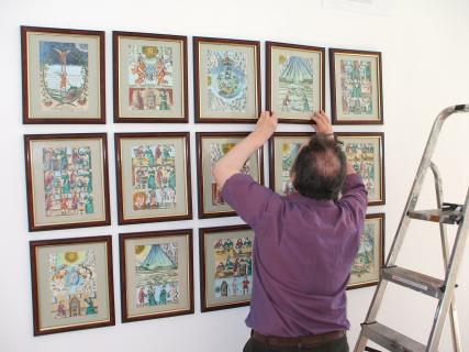Installing the Alchemy Exhibition at the Embassy Gallery in Edinburgh, 2007 Back to Alchemy and Art page Myself, my partner Franzeska and the curator of the exhibition, Ronnie Heeps travelled to Edinburgh on Tuesday 24th July to begin the installation of the exhibition of my paintings and prints at the Embassy Gallery which will be running throughout August during the Edinburgh Festival. Apart from helping with setting up the exhibition Franzeska kindly agreed to photograph the work in progress, and I will put up the photos here over the next week or so. Fully illustrated book of the exhibition is now available.