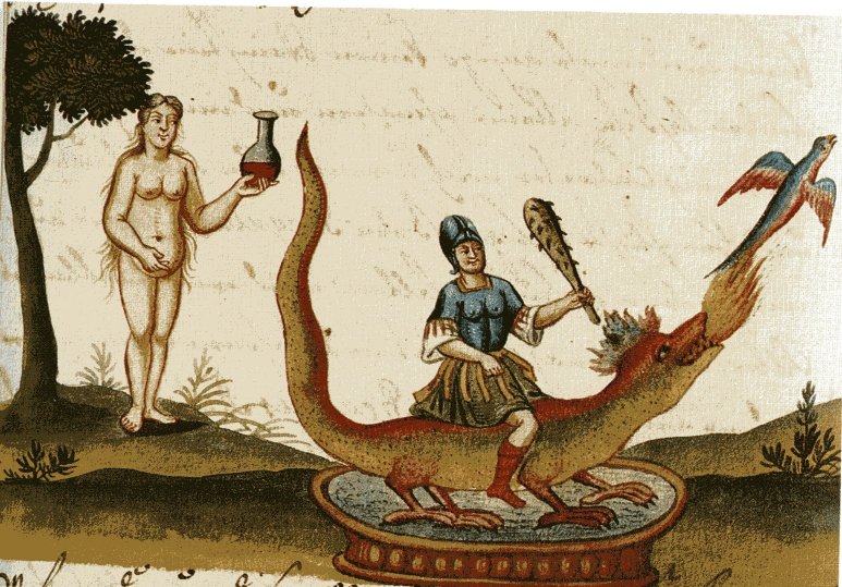 The ornamentation of the book is interesting not only thanks to the original alchemic iconography, but also thanks to its high artistic value that was not common for all alchemic manuscripts. A greater part of the 23 illustrations were probably created by one of the Rožmberk court painters, while Griemiller himself made perhaps only a few of them. From the iconographic point of view, the most distinct works are two miniatures on ff. 183v-184r. On the left side, there is a naked man with wings, standing on the moon and blowing a trumpet: he is raising the sun and the moon - which he has beheaded earlier with an axe - from the dead. It is an alchemic symbol of killing and resuscitation of the substance of the Great Work. On the opposite side, a naked queen is standing on two knolls from which two streamlets are running, while on the right side the sun has risen in the sky and on the left side the moon. This is an alchemic symbol of the two fundamental roots. The queen is holding burning torches and from her head a tree is growing with both arriving and departing birds that symbolize the central axis of alchemic art.