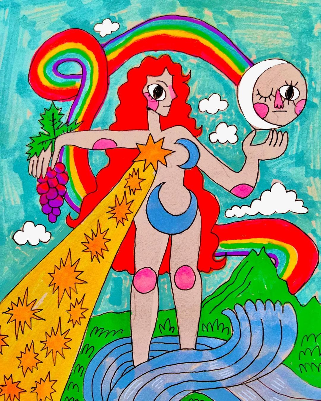 "Budzar appropriates these alchemical illustrations and applies her child-like style to it, creating a series of playful images where a central, often feminine presenting figure, is interacting with the natural world around them. Their expressions range from neutral to positive, but never negative. They seem to either be floating in an imaginary space or have their feet firmly planted in the flat landscape around them. One piece, The Phenomenon of Light, showcases yet again another feminine figure with long red hair and moons covering their private parts. In their outstretched hands are grapes and what appears to be a round mirror, which can be read as gluttony and vanity respectively. From the figure’s left breast, stars shoot out. A dynamic natural landscape plays out behind them, with curving waves and winding rainbows., “The characterization of science and magick turning the wheel of the natural world is probably like one of the freakiest things you can make art about,” Budzar wrote."