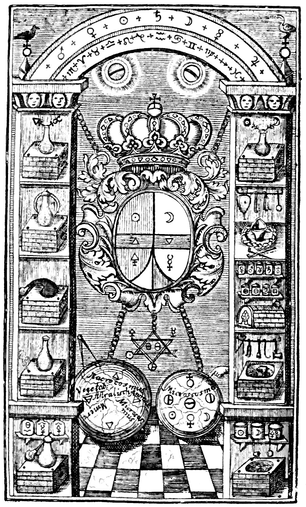 An arch containing the seven planets and the 12 signs of the zodiac, is supported by two square columns. On the top of the left column a black crow perches, while on the right a white swan is seen. The two columns are each divided into five section each depicting items of alchemical apparatus, alembics, furnaces, retorts, pelican flasks, crucibles, etc. Between the columns there is a coat of arms with the symbols of sun and moon, water and fire, sulphur and mercury. On the floor below are two globes, one labelled macrocosmus and the other microcosmus.