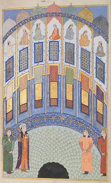"From a miniature belonging to a magnificent Iskandar Anthology (Persia, Šīrāz, 1410-11, folio 66v; Lisbon, Calouste Gulbenkian Foundation), the cosmology, the symbolism of the seven colors (haft rang) and the alchemical progression are analyzed in the mystical tale Haft paykar (Seven princesses) by the Persian poet Abū Md. Ilyās b. Yūsuf Niẓāmī Ganǧawī (d. ca. 570-610 / 1174-1222). This inner path of transmutation through colors (ch.:pp.: black: HP26:180-181; yellow: HP27:196-197; green: HP28:214; red: HP29:234; blue: HP30:266-267; sandalwood: HP31:291 and white: HP32:315) ends, in tune with the Iranian tradition (Mazdeism, Zoroastrianism, išrāqī illuminative wisdom), with the color white, symbol of the purity of the soul and enlightenment."