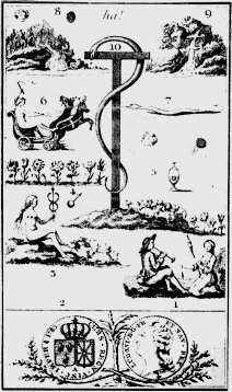 Frontispiece engraving. 129x75mm. 10 images - a shepherd playing a pipe while a woman spins - two medals with a palm tree - a seated woman holding a caduceus while sheep lie at her feet - seven flowing plants in a row - the sun and moon send their rays into a flask - a woman drives a chariot pulled by three differently coloured horses - a snake moves along the ground - the sun and moon shine above a mountain from which a stream flows - a stream flows from a mountain - a snake is crucified on a tau cross.