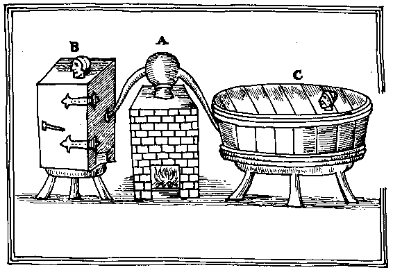 A. Signifies a hot still with two pipes going into two wooden vessels. In this still you may put either herbs, spices, with water or with spirits, and distill them, by which means they that are in the vessels will presently be forced into a sweat by virtue of the subtlety of the vapors. And this indeed is as good and effectual a way for sweating as any can be invented. You may by this means appropriate your ingredients to the nature of the diseases.