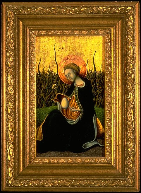 Oil, gold and copper leaf, and actual dirt on lower portion of painting