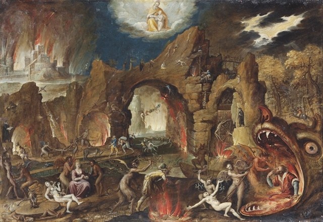 I found this rather fine painting by Jan Mandyn, one of the Antwerp-based followers of Hieronymus Bosch. This is one of his paintings on the theme of the Temptation of St Anthony. Here I show just a small section from the right hand side, which I find rather engaging.